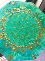 木製八掛けの龍体文字を施したフトマニ図が完成しました。高品質の木材を使用し、丁寧に仕上げたこのアートは、グリーンのグラデーションとゴールドが高貴な雰囲気を漂わせています。