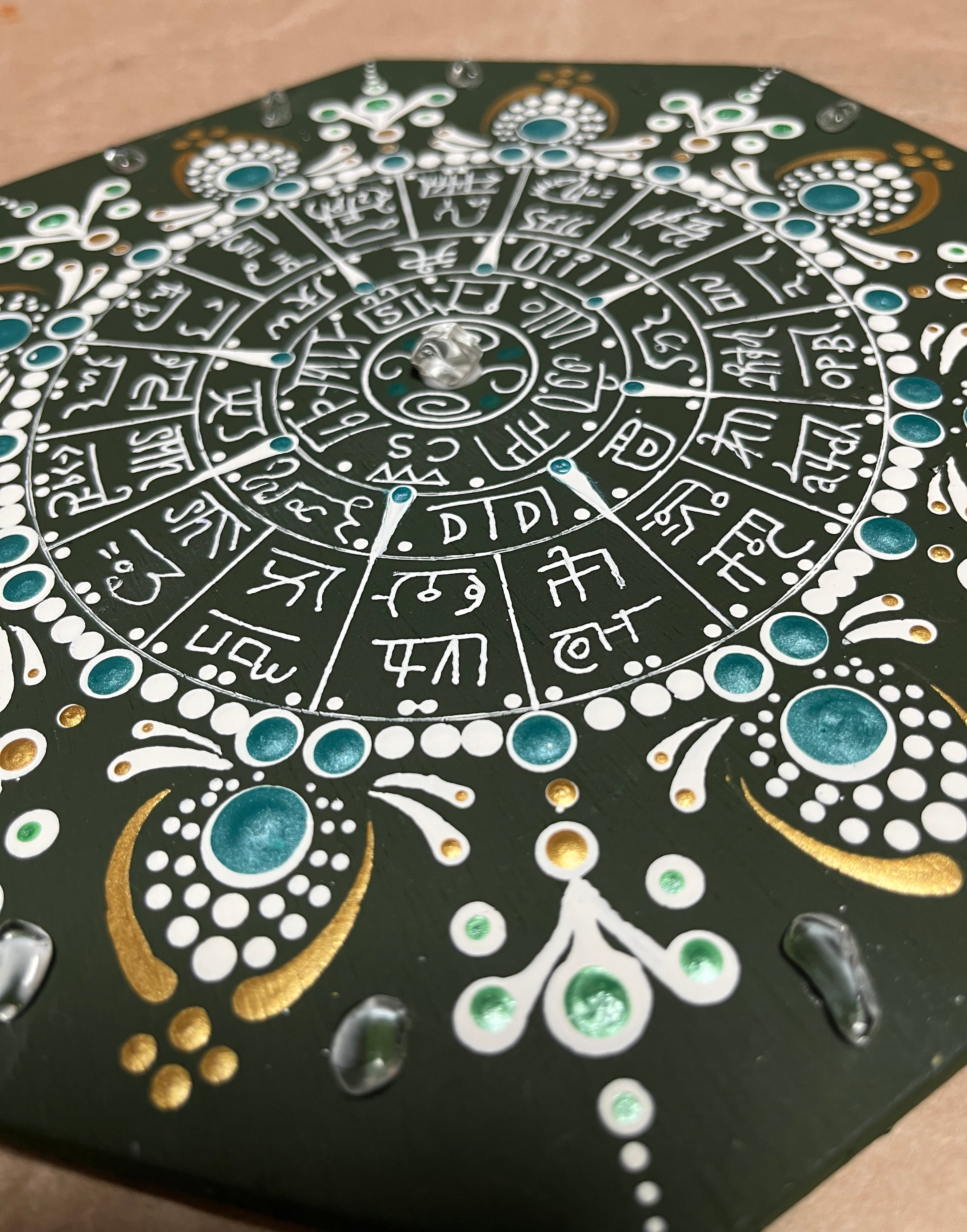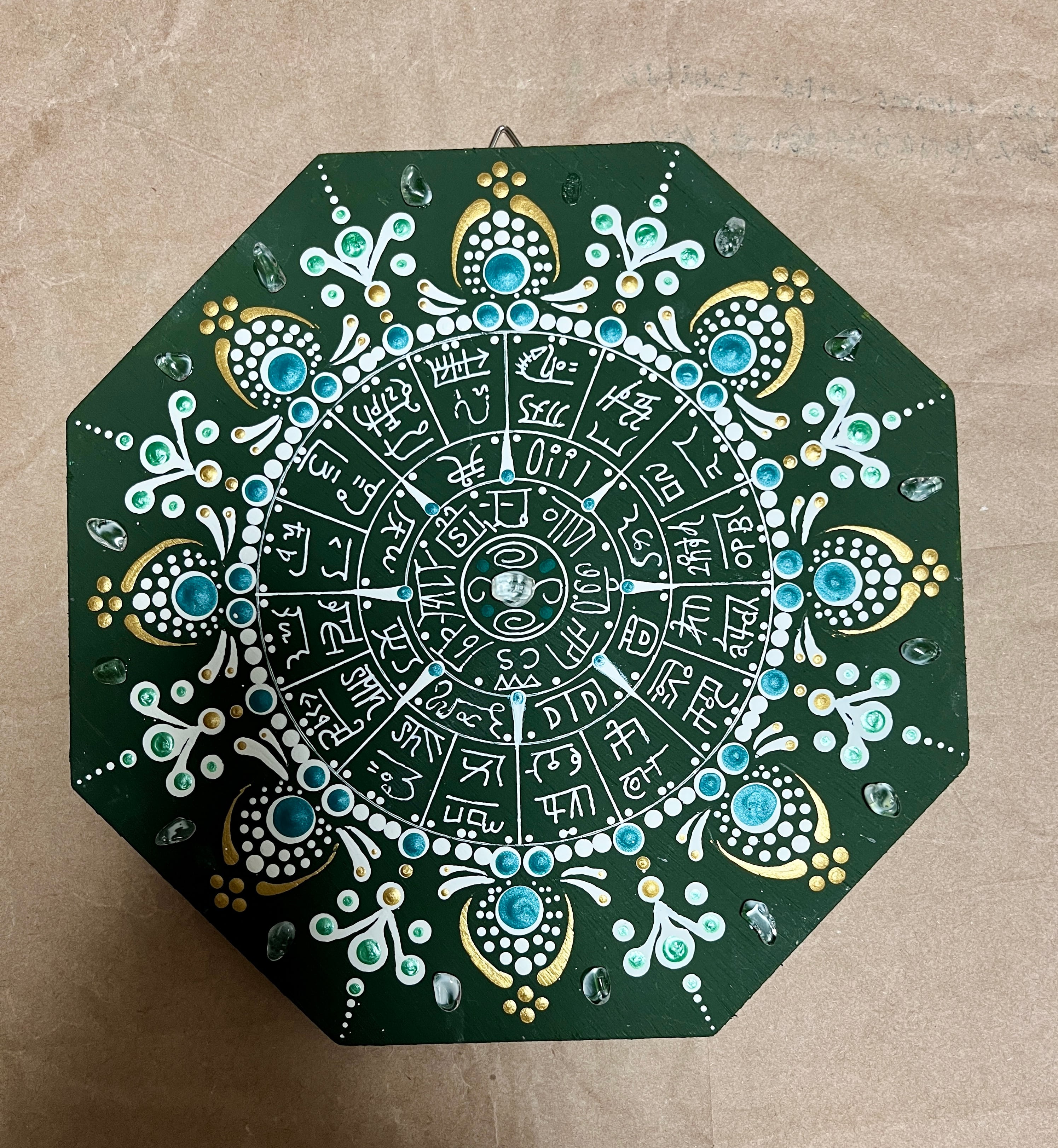 木製八掛けの龍体文字を施したフトマニ図が完成しました。高品質の木材を使用し、丁寧に仕上げたこのアートは、白と金色とブルーグリーンでゴージャスな雰囲気を漂わせています。